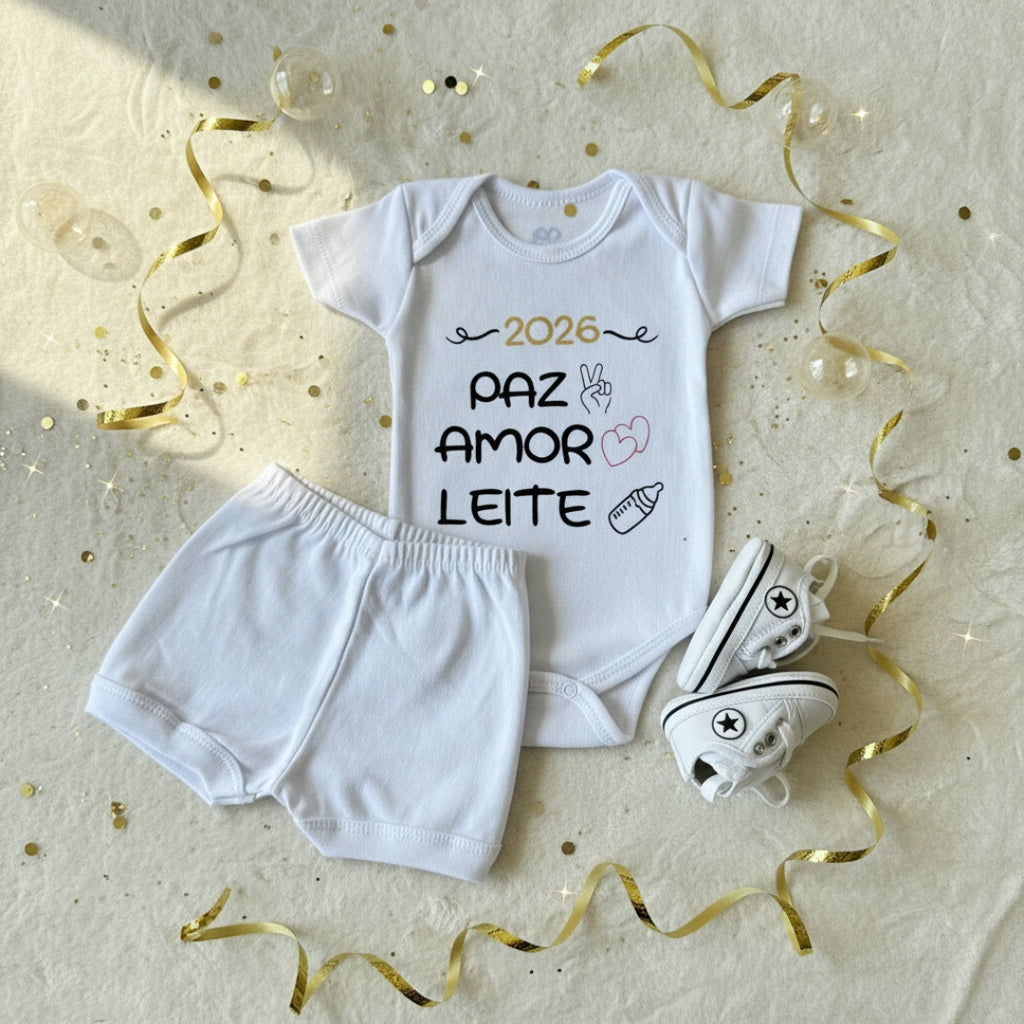 - 👶 1 Body Infantil com estampa "2026 - Paz, Amor e Leite" (ícones de paz ✌️, coração 💛 e mamadeira 🍼)